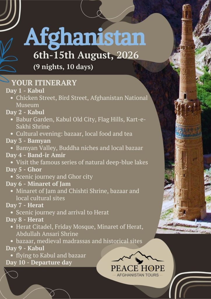 This journey moves at a comfortable pace, from Kabul’s lively bazaars and gardens to Bamyan’s peaceful valley, the deep-blue lakes of Band-e Amir, the remote Minaret of Jam, and the timeless streets of Herat.